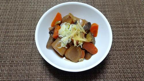 そのまま粗熱を取り、冷めてから再度温めて皿に盛る。千切り生姜と小口切りの長ネギを散らして完成。好みで七味唐辛子をかけてもよい。