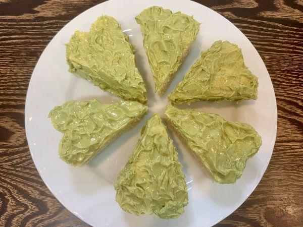 できあがったケーキはすぐに型から外し、冷ます。 好みの大きさに切ったら、全面に抹茶バタークリームを塗ってできあがり。