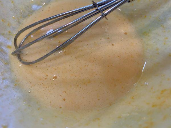 1個の卵をまず卵黄と卵白に分ける。卵白をほぐして半分に分け、半分に分けた卵黄と混ぜて半個分の全卵液を作る。これは後でケーキ生地に使うので小鉢に入れておく。 小鍋に砂糖と水を入れて火にかけ、煮立てる。 ボウルに残った半個分の卵黄を溶き、熱いシロップを少しずつ注ぎながら、少し冷めてトロッとするまで手早く泡立てる。