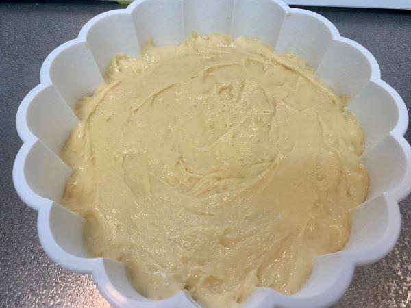 電子レンジ用デザート型に生地を流し入れる。ヘラで表面を平らにならしたら、600Wの電子レンジで4分加熱する。