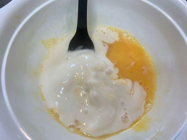 STEP1で作っておいた半個分の全卵液をボウルに入れ、溶かしたアイスクリームを加えてしっかり混ぜる。さらにホットケーキミックスを加えたのち、サラダ油を入れてまんべんなくさっくり混ぜる。牛乳が入らないため、できあがった生地はかなり固い。