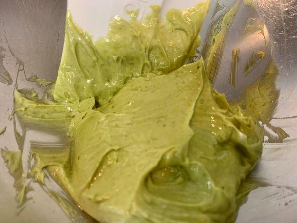 別のボウルにバターを入れ、ふんわりするまで泡立器でねる。そこへ、冷めた卵黄液を少しずつ加えて混ぜ合わせる。最後に抹茶を加えてさらに混ぜ、冷蔵庫で冷やす。