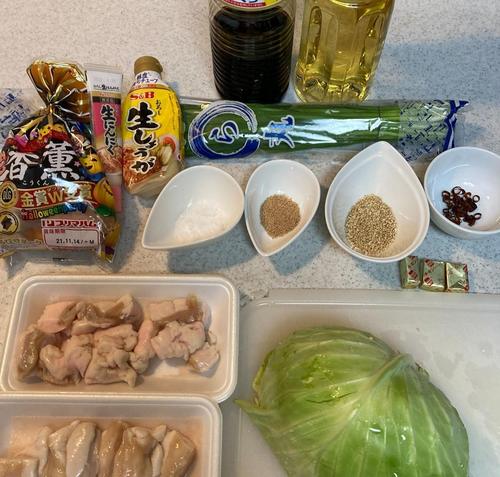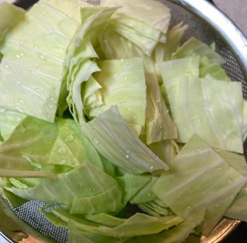 キャベツは芯を除いて4cm角にカットする。ニラは根元を落として4cm幅にカットする。