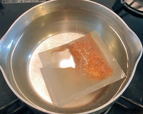 鍋に出汁パックと水を500ml程度入れて、中火にかける。沸騰してから2分程度煮たら、出汁パックを取り出す。