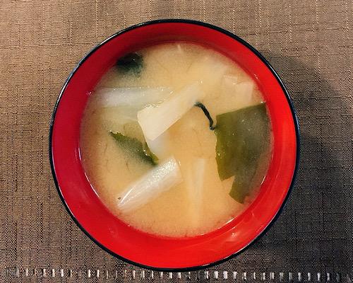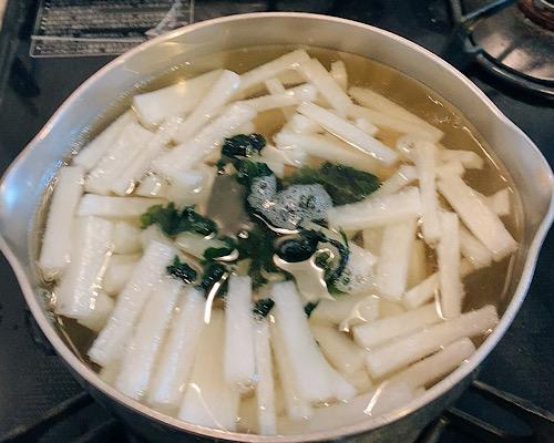 出汁に大根とカットわかめを入れて、中火で5分程度煮る。