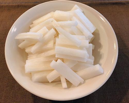 大根の皮を剥き拍子木切りにしたら、耐熱皿に入れて600Wの電子レンジで2分程度加熱する。電子レンジで大根を柔らかくすることで、時短に繋がる。