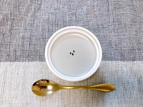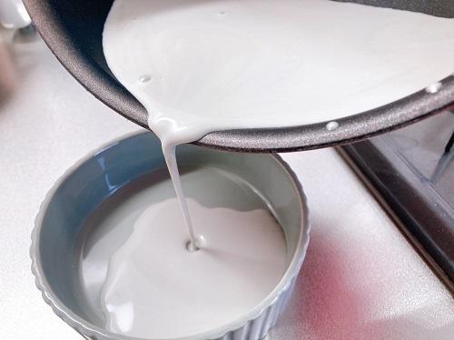容器にうつす。泡立たないように静かに追加できるとよりよい。粗熱をとったら冷蔵庫で30分以上冷やす。