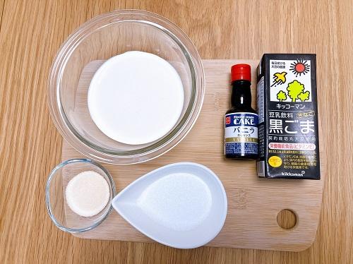 豆乳、生クリーム、グラニュー糖を鍋に入れ、弱火で加熱する。沸騰しないように木べらでかき混ぜながらグラニュー糖を溶かしていく。グラニュー糖が溶けたら、沸騰直前まで温度をあげる。分離してしまう原因になるので沸騰はさせない。