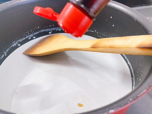 火を止めて、バニラエッセンスを加える。ふやかしたゼラチンも加えて、溶かすように混ぜる。