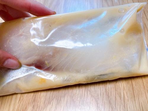 タラを袋にいれて、空気を抜きしっかり浸かるようにする。身が崩れないように注意する。冷蔵庫で半日ほど寝かせる。最短30分程度でもOK。