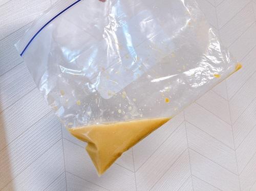 甘酒、しょうが、味噌をすべて密閉できる袋の中で混ぜておく。味噌の塊がなくなるように溶かしておく。