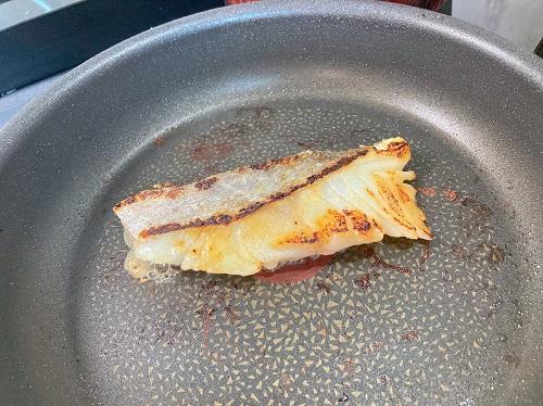 タラは皮目からしっかり焼き目をつけながら中火で焼く。身が崩れないように注意しながら焼いていく。