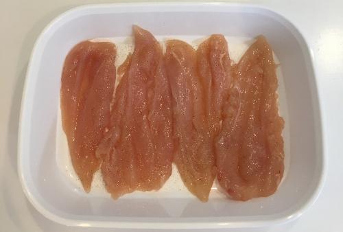 鶏ささみは筋をとり、観音開きにして厚みを均一にする。塩こしょうを両面にふる。