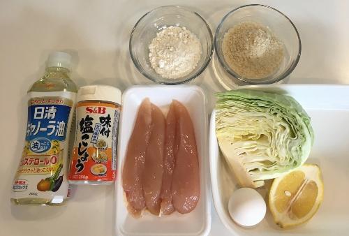 キャベツは千切りにして、水にさらしておく。レモンはくし切りにする。