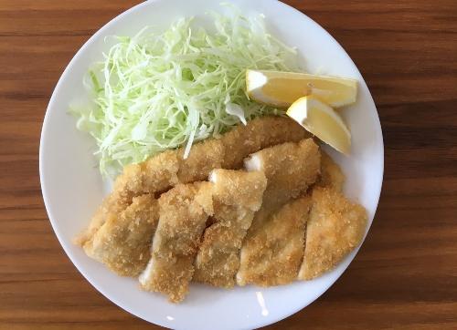 揚がったら食べやすい大きさに切り、キャベツ、レモンと共に皿に盛りつければ完成だ。