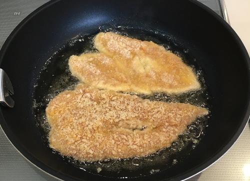 フライパンに5mmほどサラダ油を入れ、衣をつけたささみを揚げ焼きにする。片面約2分を目安に、しっかりと中心まで火を通す。