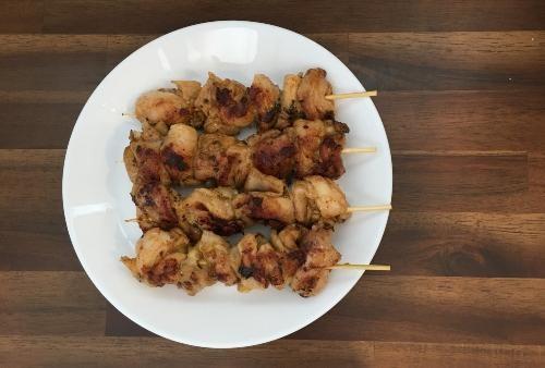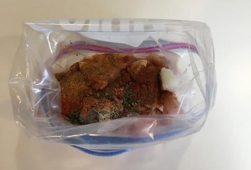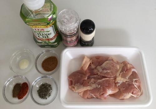 保存袋に鶏肉、チリパウダー、ガラムマサラ、カレー粉、ドライバジル、オリーブオイル、すりおろしにんにく、塩こしょうを入れる。袋の上から揉み、全体に調味料をまぶす。袋の空気を抜いて口を閉じ、冷蔵庫で1時間味を馴染ませる。