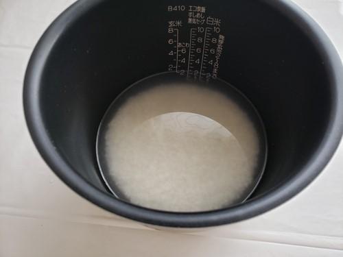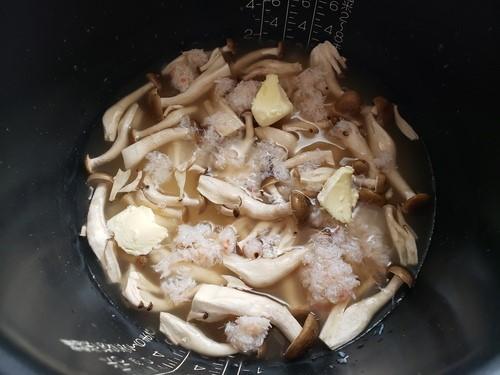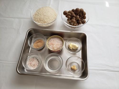 かにの身、しめじ、バターを米の上にまんべんなくのせる。30分程度浸水させて、通常通り炊飯していく。具材を米と混ぜると潰れてしまいべたっとした食感になるので、米の上にのせて炊くのが美味しく作るコツとなる。