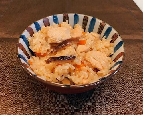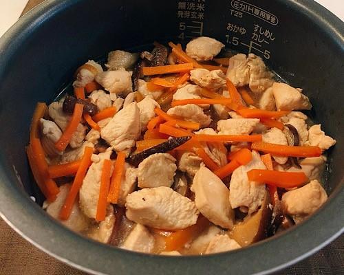 もち米を浸していた水を一度捨てて、煮汁とシイタケの戻し汁を入れる。3合の水分量まで、水を加えて調整する。具材も入れて、炊飯したら完成となる。
