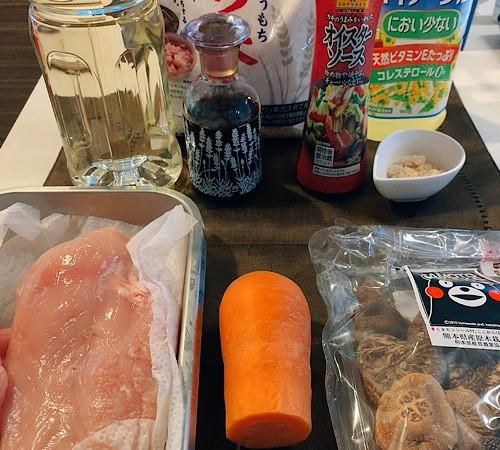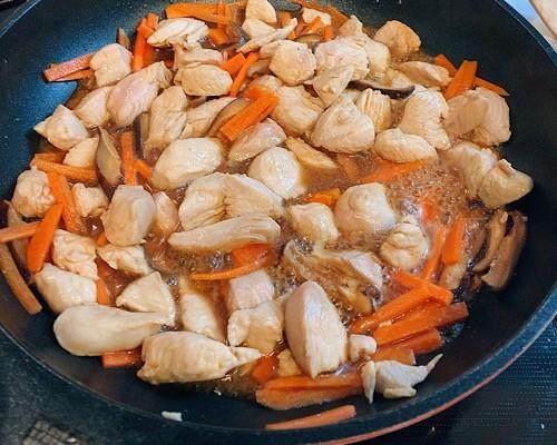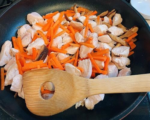 フライパンにサラダ油をひいて、一口大に切った鶏むね肉、シイタケ、にんじんを入れて中火で炒める。