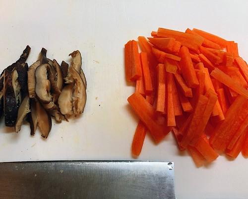 シイタケはぬるま湯で戻してからそぎ切りにして、にんじんは細切りにしておく。その際、シイタケの戻し汁は捨てずにとっておく。もち米は洗って、水に浸しておく。