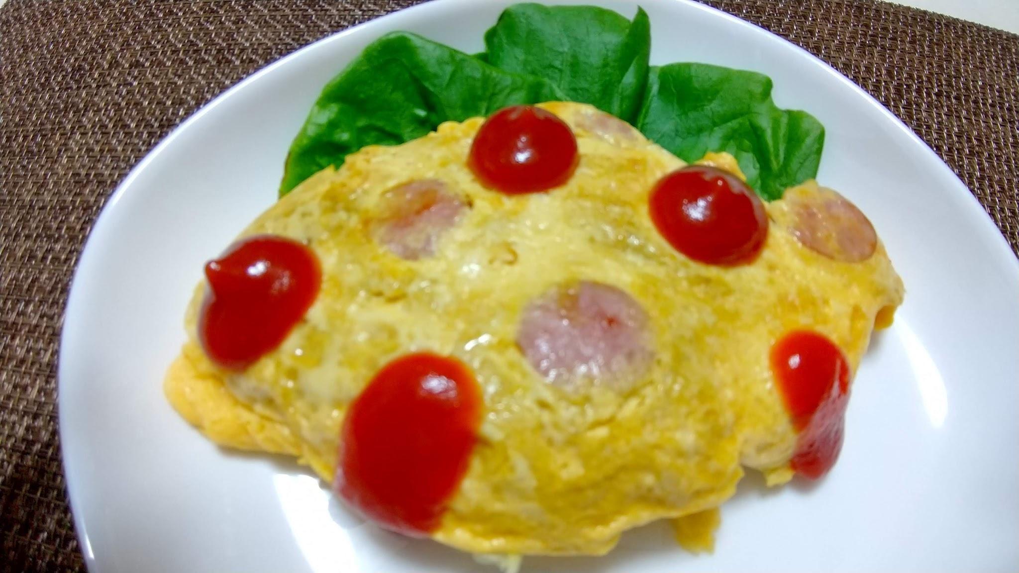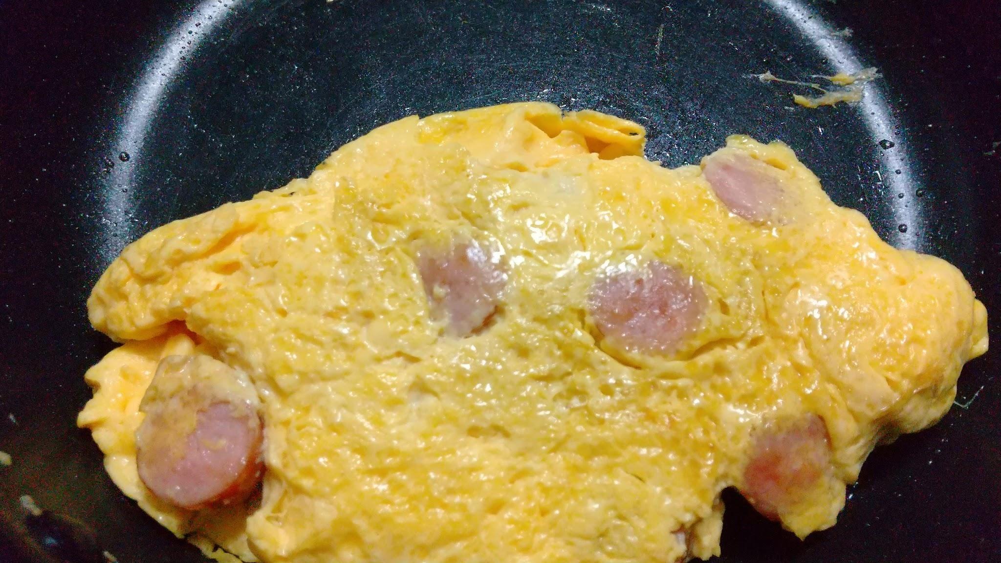 卵を入れ、弱火で3分程度焼く。固まってきたら周りからまとめてひっくり返して、1分程度焼いたら完成。皿に盛り、ケチャップを適量かける。