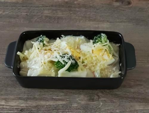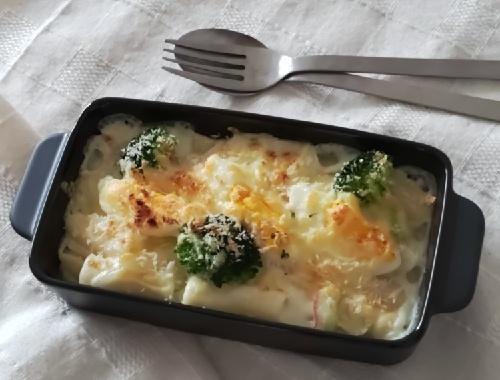 グラタン皿に具材のマカロニを盛り、茹でブロッコリー、茹で卵を乗せる。最後にピザ用チーズ、パン粉をトッピングし、オーブントースターで5~10分程焼く。好みの焼き色がついたら完成。