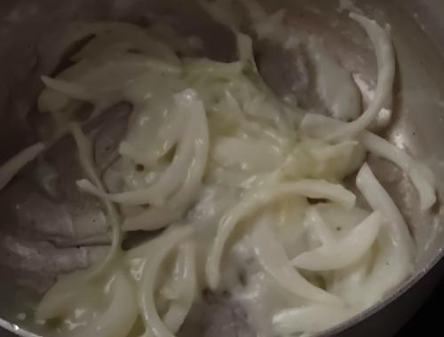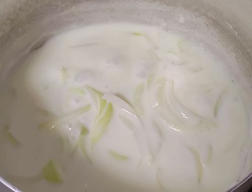 炒めた玉ねぎと薄力粉に少しずつ牛乳を加えて弱火で混ぜていく。全体がとろっとしてきたら一度火を止める。