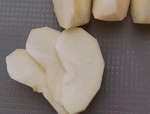 りんごは皮をむいて芯を除き、8等分にカットした後、さらに1切れを3~4等分にスライスする。