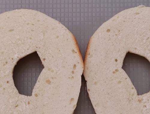 ベーグルは横半分にスライスする。表面がカリッとする程度に1~2分トーストして、粗熱をとる。