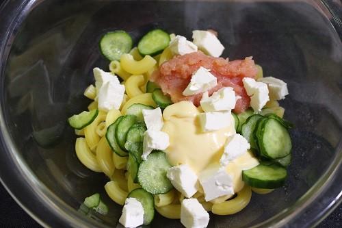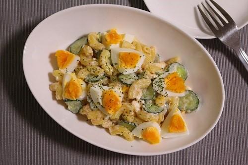 ボウルに粗熱を取ったマカロニ、明太子、きゅうり、ちぎったクリームチーズ、マヨネーズを加え全体を混ぜ合わせる。塩・こしょうで味を整え、茹で卵とともに器に盛りつけて完成だ。お好みで乾燥パセリを振ってもよい。