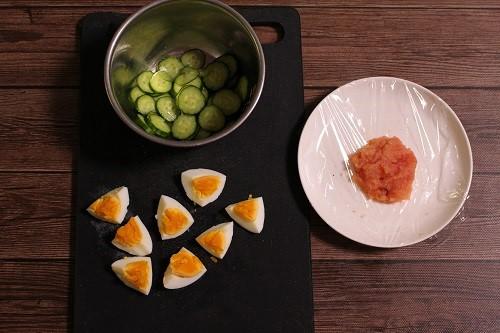 きゅうりは端を落とし、薄くスライスして塩(分量外)少々をまぶして5分程度置いておく。水分がでてきたら水にさらし、水気をきっておく。明太子は、薄皮に切れ目を入れて中身を取り出し、ほぐす。茹で卵は殻を剥き、一口大に切る。