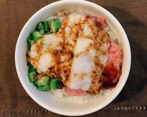 深めの皿に炊き上がったごはんを盛り付けて、マグロのたたきとオクラをのせる。その上からすりおろした山芋をのせて、わさび醤油をかけたら完成となる。