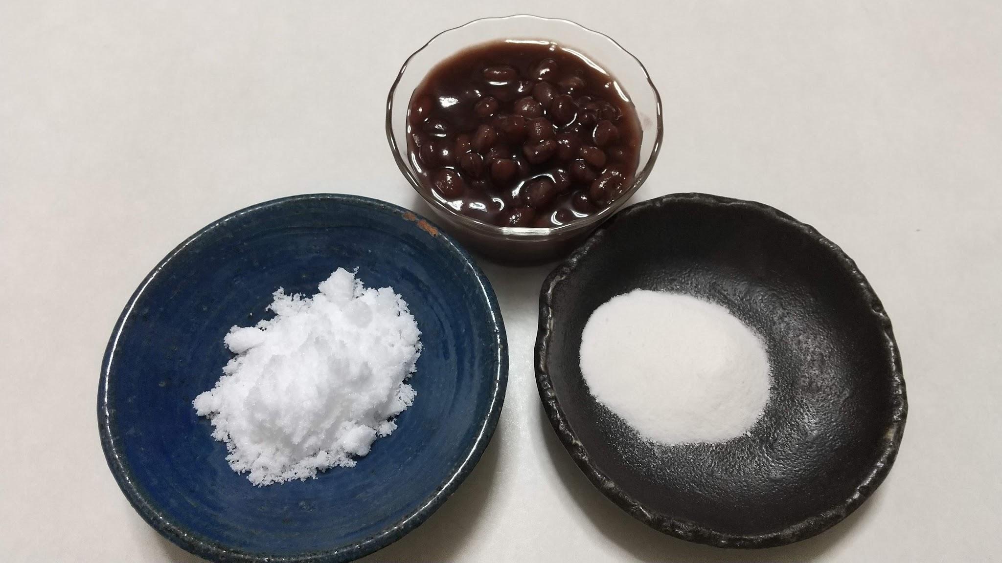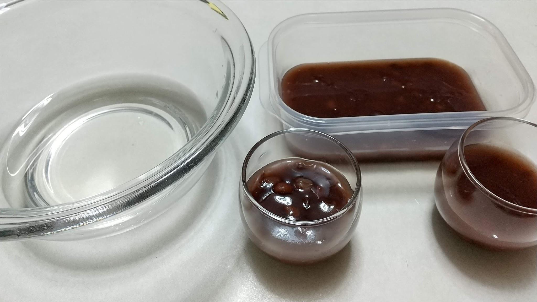 アガーと砂糖を溶かした水は、鍋に入れて弱火にかけるか、電子レンジで軽く沸騰させる。きちんと2層が分かれるように、先に小豆部分だけを固める。容器に茹で小豆缶と沸騰したアガー水を入れて軽く混ぜ、10分程度待つ。