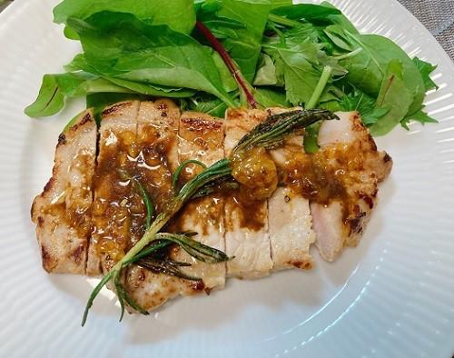 ソース全体に火が通ったら豚肉にかけて完成。さわやかな味わいで食べやすい一皿だ。