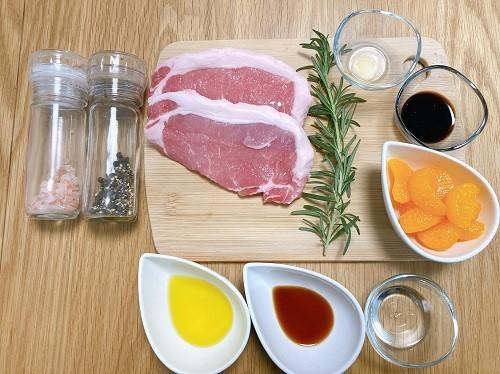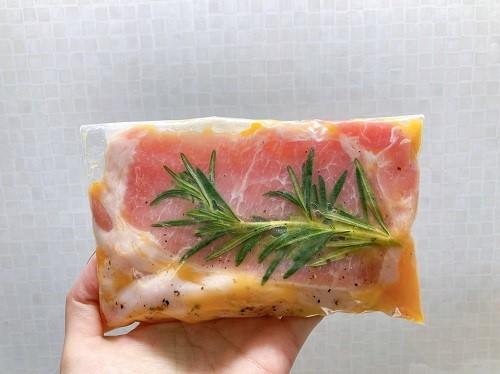 ジップロックに豚肉、みかんを半分、ローズマリー、料理酒、塩コショウを適量入れ、よく揉みこむ。空気を抜いた状態で、10分程度休ませる。
