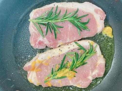 オリーブオイルを引いたフライパンを熱し、にんにくを加える。豚肉をしっかり焼き目をつけながらソテーする。ローズマリーも熱する。