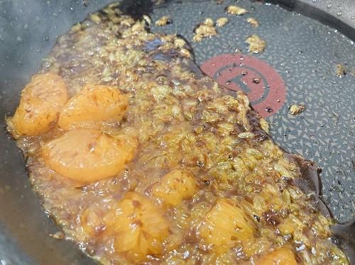 豚肉を皿にうつし、残った脂でみかんに弱火で火を通す。みかんが温まったらバルサミコ酢と醤油を加える。