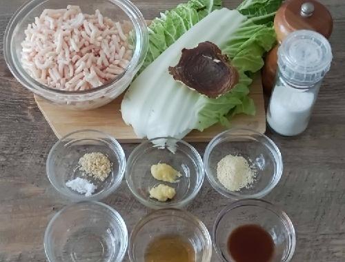 干ししいたけは器に入れ、100ml程度の水を加えて600Wの電子レンジで1分加熱する。粗熱がとれたらみじん切りにする。白菜は1cm幅の短冊切りにしておく。