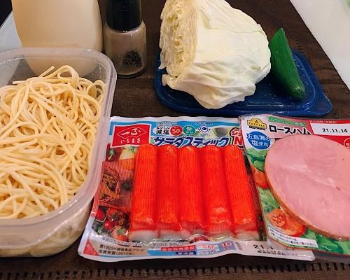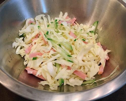 キャベツは固いところを除いて粗めのせん切り、キュウリは端を落として細切り、ハムは短冊切りにして、ボウルに入れておく。