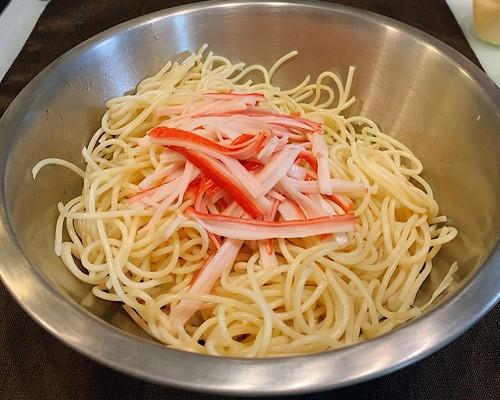 余ったパスタの長さを3等分くらいに切って、ボウルに加える。