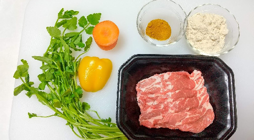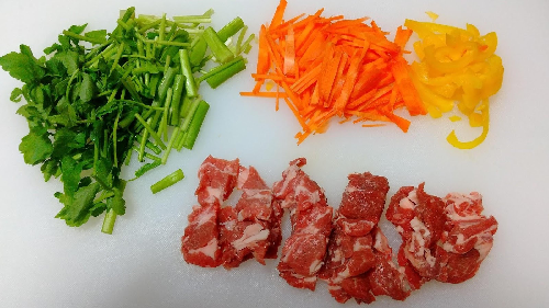 ラム肉はひと口大に切る。人参は端を除いて皮をむき、千切り。パプリカもヘタと種を除いて細めに切る。セリは根元を除き、適当にひと口大の長さにザクザク切る。好みでパクチーを使用してもよい。今回はセリやパクチーなど、ラム肉に合わせて香りの強い葉物を使いたい。