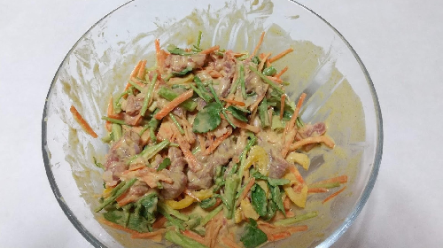 本文 STEP1の材料を全てボウルに入れる。そこに小麦粉とカレー粉をよくまとわせてから、少しずつ水(120g程度)を入れていく。よく混ぜながら水を入れて、十分に絡む程度にする。ふんわり仕上げたい時は、ここに卵を追加してもよい。