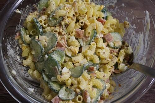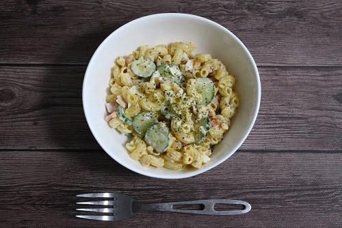 ボウルに、マヨネーズと粒マスタードを入れてよく混ぜ合わせる。マカロニ、水気を切ったきゅうり、ハム、スモークチーズ、茹で卵を加え、全体をよく和えて塩・黒こしょうで味を調える。