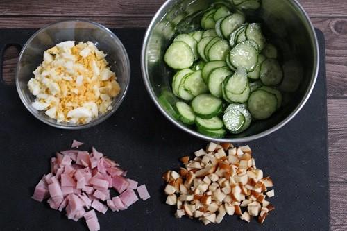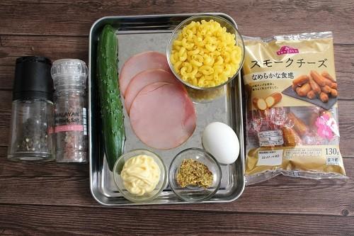 きゅうりは端を落とし、2~3mm程度の薄切りにする。塩少々をふりかけ、しんなりするまで10分程置いておく。ハムは1cm角に切り、スモークチーズ、茹で卵は、粗みじん切りにする。