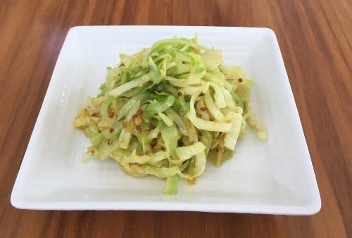 塩こしょう、粒マスタード、カレー粉を加えて、手早く混ぜる。キャベツが少ししんなりしたら火からおろす。