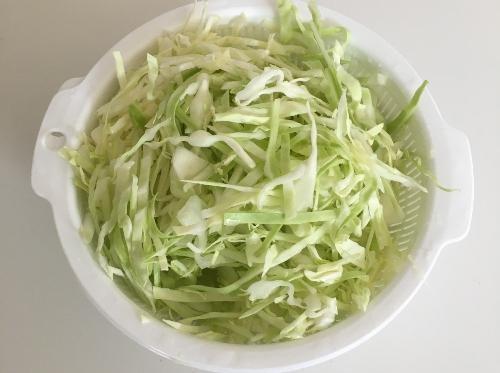 キャベツは流水で洗って根元を落とし、5mm幅の太めの千切りにする。