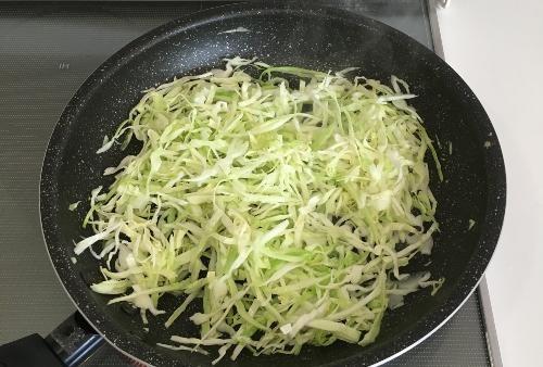 フライパンにオリーブオイルをしき中火にかける。温まったらキャベツを加え、全体に油を馴染まる。