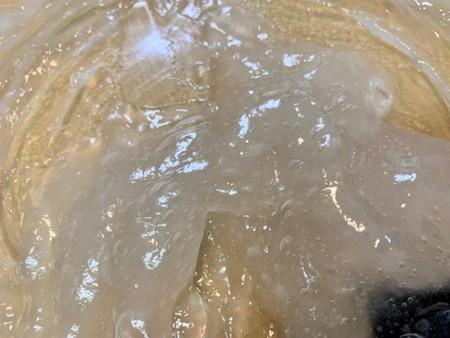 寒天液を半量だけ葛粉の液に混ぜ、さらに500Wの電子レンジで加熱する。1分ごとに扉を開け、スプーンやへらでダマにならないようかき混ぜ、さらに1分ずつ加熱する。写真は5分50秒経過した状態で、この状態になれば火が通っている。