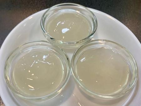 3~4cm程度の深さのある耐熱皿に水50cc、本葛粉を入れてよく混ぜる。ラップをぴっちりとかけ、500Wの電子レンジで1分加熱する。1分間加熱した段階では、写真のような状態になっている。